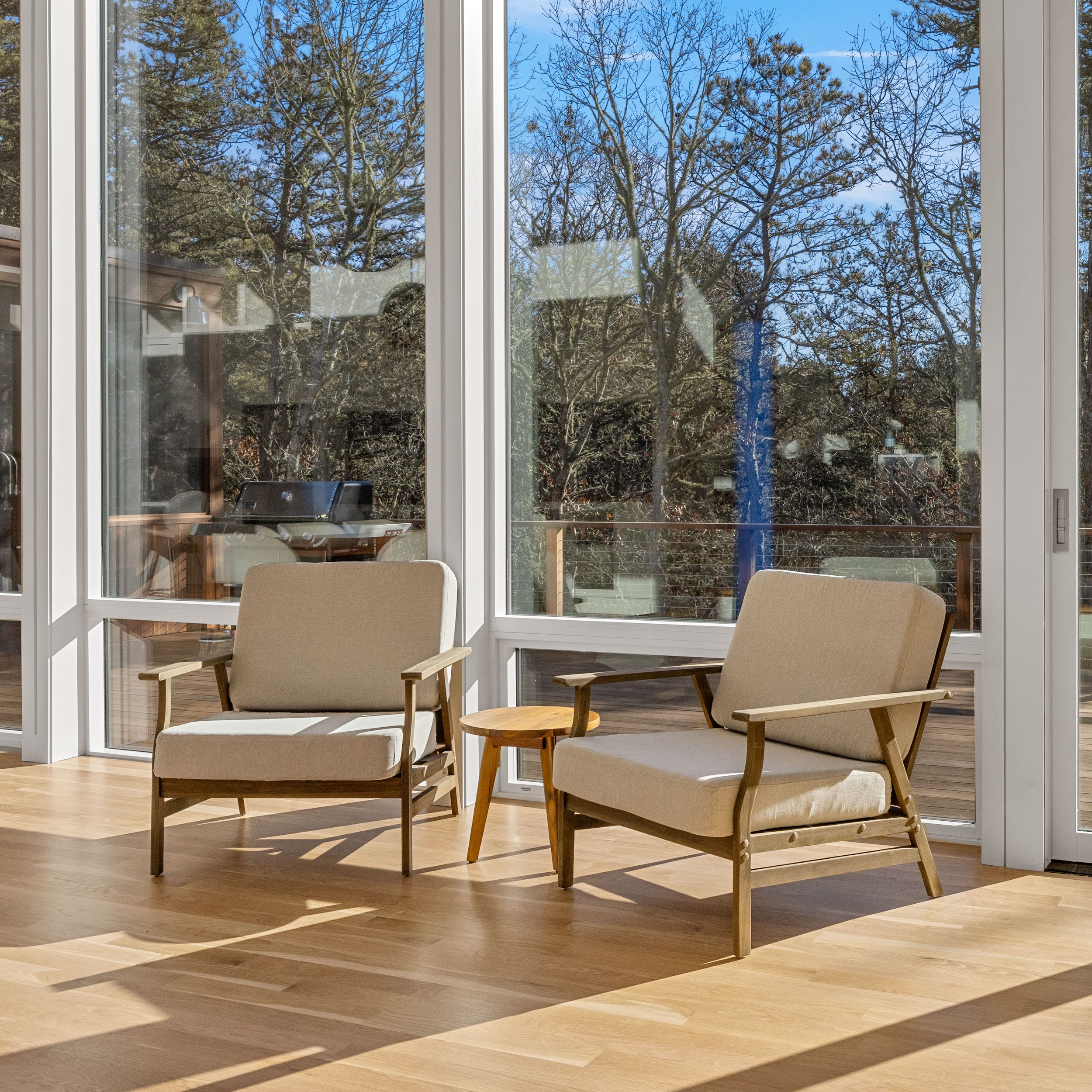 Classic shingles, clapboard, and gambrel or gable roofs remain common, but with refinements such as larger windows, energy-efficient glazing, and simpler, cleaner lines.